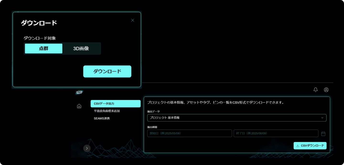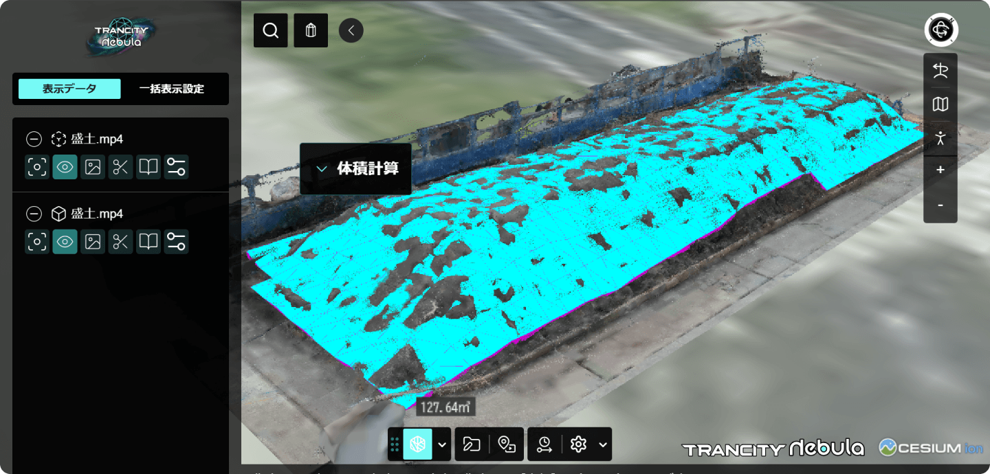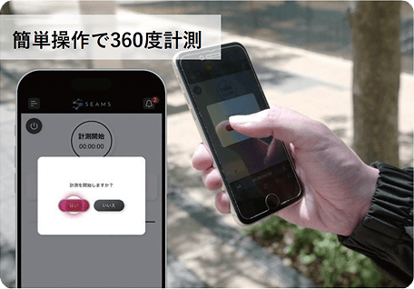 歩行計測可能な3次元データ計測システム「SEAMS」で計測したデータをTRANCITYにアップロードするだけで、歩行者や車両といったノイズを除去した高品質の広域点群データを地図基盤上に自動生成