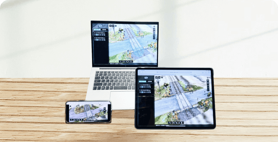 高性能PCや特別の機材は不要です。WEBブラウザ上で動作するので、お手持ちのPC、タブレット、スマホなど、インターネットに接続したどんな端末からも、3Dデータを閲覧することができます。データ容量が大きく、従来取り扱うことが難しかった点群、3Dデータもサクサク動きます。