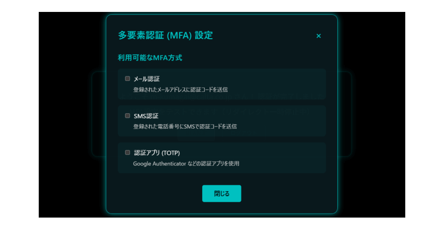 多要素認証を採用しています。メール認証、SMS認証、認証アプリのいずれかを選択でき、お客さまの利用環境に応じた安全な認証方式で運用することが可能です。